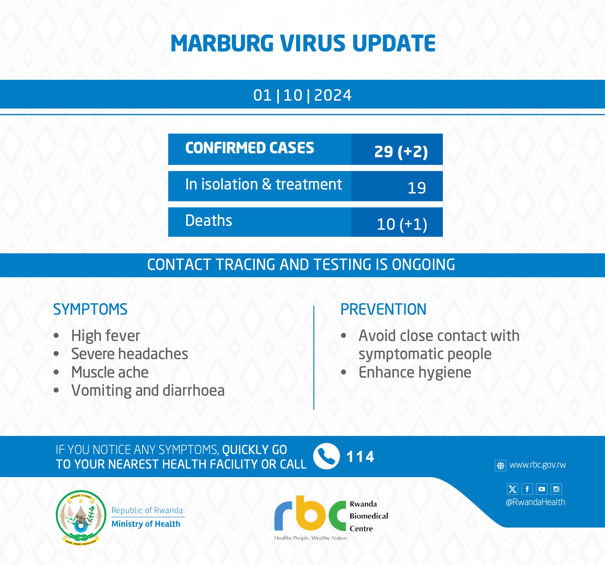 According to the figures from the ministry of health in Rwanda, as of today 01 October 2024, ten people have died so far from Marburg Virus Disease (MVD) while other 19 people are in isolation and on treatment.