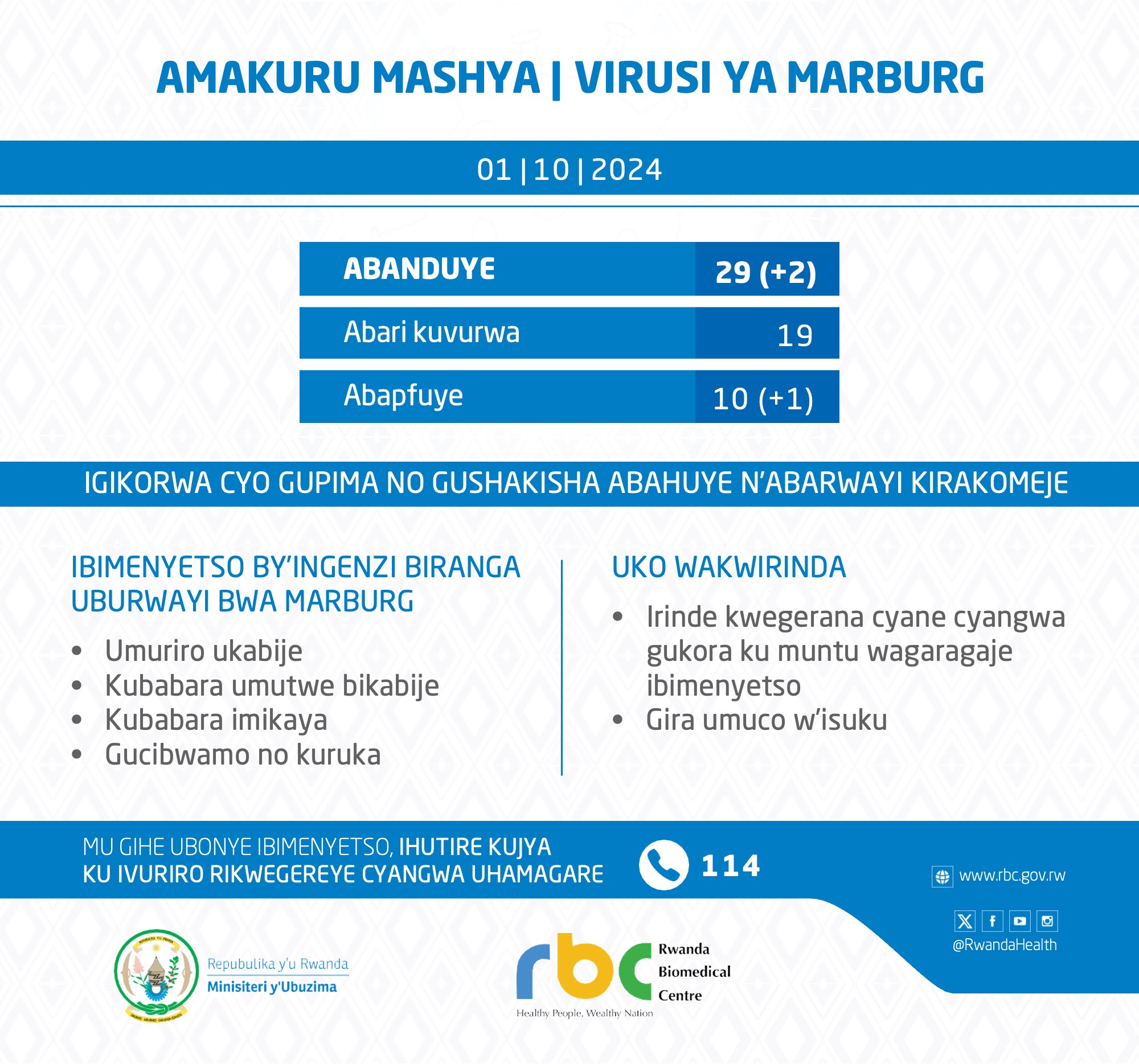 Imibare mishya ya Minisiteri y’Ubuzima mu Rwanda, yatangaje ku mugoroba wo kuri uyu wa Mbere tariki 01 Ukwakira 2024, yagaragaje ko umubare w’abantu bamaze kwicwa n’icyorezo cya Marburg wageze ku 10 mu gihe abandi 19 barikuvurwa.