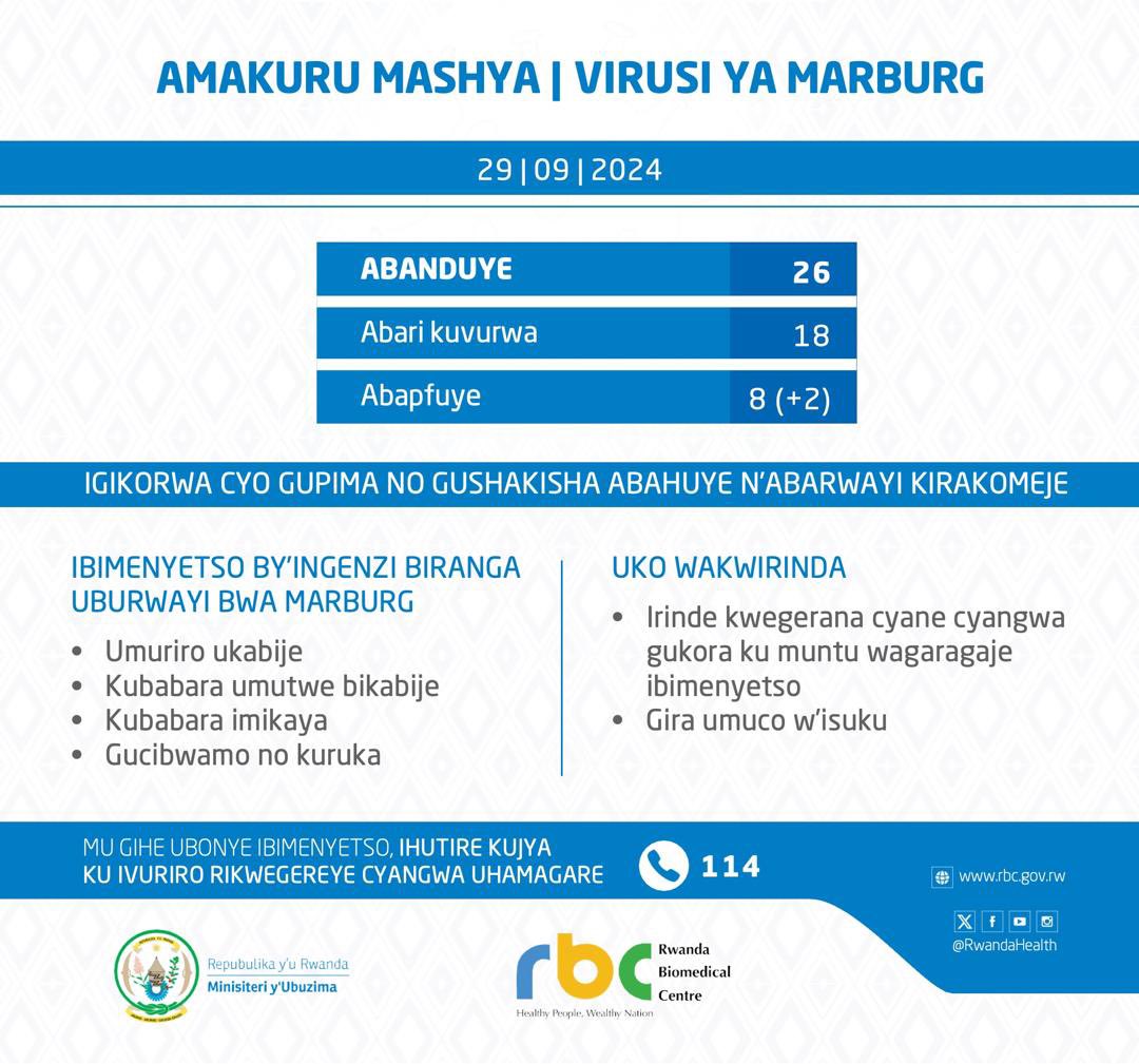 Imibare mishya ya Minisiteri y’Ubuzima mu Rwanda, yatangaje ku mugoroba wo kuri iki Cyumweru tariki 29 Nzeri 2024, yagaragaje ko umubare w’abantu bamaze kwicwa n’icyorezo cya Marburg wageze ku 8 mu gihe abandi 18 barikuvurwa.